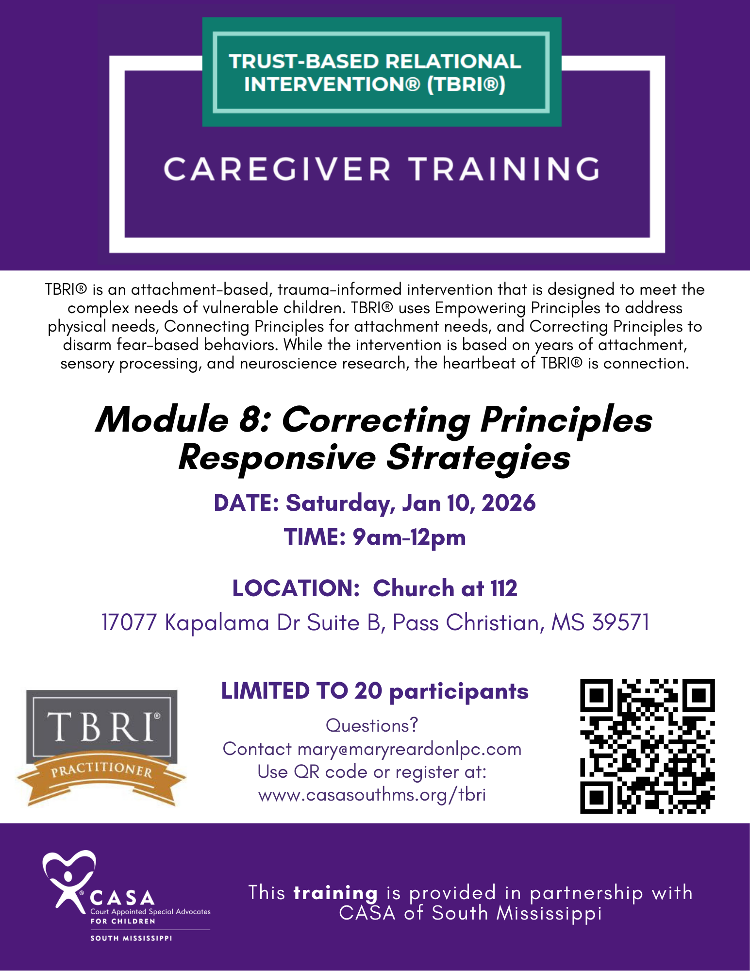 CASA of South Mississippi coordinates the statewide implementation of TBRI across multiple sectors including Youth Courts, juvenile justice, mental health professionals, educators, child welfare, and many others.